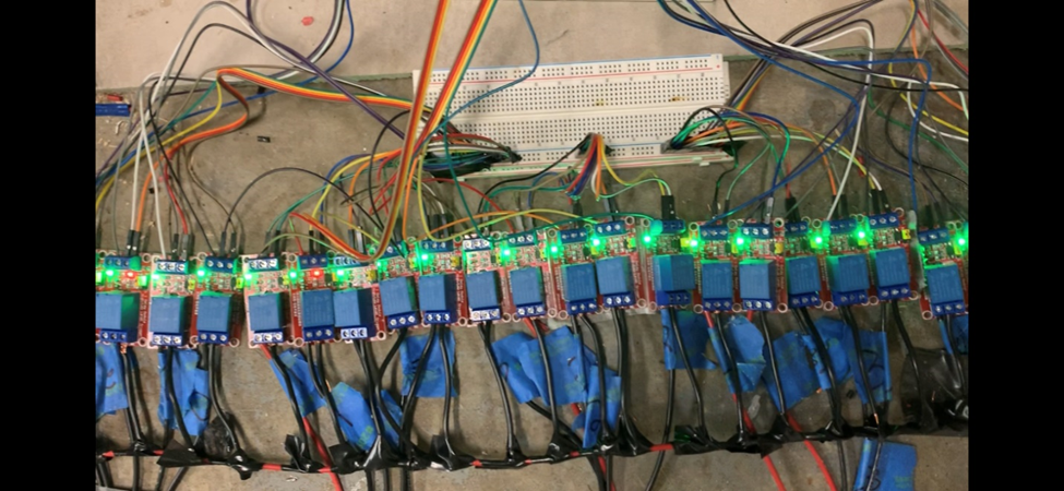A relay array determined when each tile would receive power. These were controlled by an Arduino microcontroller connected to AWS IoT. It communicated with Java code running in the cloud that planned out pick and place locations for each of up to 3 robots, estimated the exact time each tile would be occupied by a bot, and dynamically ran a pathfinding algorithm to avoid fallen products and other robots.